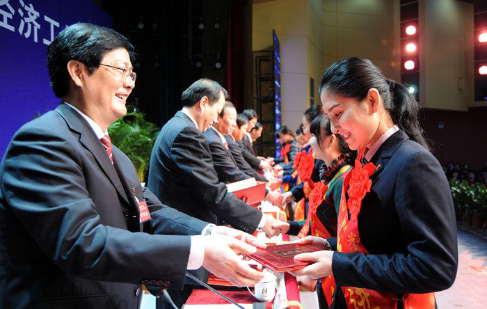 大會現場鮮花綻放、蒼翠欲滴,上午9時,在《國歌》和《華億之歌》中,在雷鳴般的掌聲中,大會莊嚴而熱烈地開幕。會議共八項議程,首先,張靖副總裁宣讀了集團2014年度表彰先進的決定,主席臺上領導分別為先進個人、先進部門、勞動標兵、優秀經營管理者、優秀經營管理單位、華億超市優秀村鎮示范店頒獎。獲獎個人和集體代表先后上臺發表獲獎感言。隨后,集團總裁項領分別與華億國際、華億置業、偉晨文化、華億城市生活廣場四家二級公司,簽訂了《2015年經營管理目標責任書》和《2015年安全生產目標責任書》。