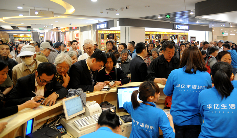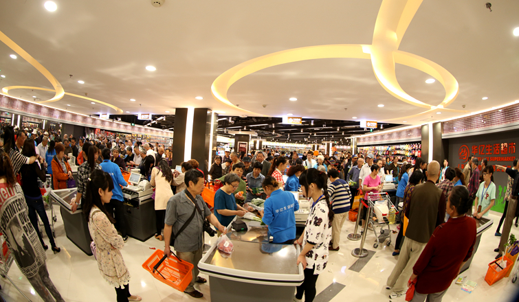 隨后,華億國際、華億生活超市星隆店開門營業。等候多時的顧客如潮水般匯聚到華億國際星隆店門口,場面火爆且有序。商場內瞬間形成了一片人海,專柜前,通道內,電梯上人頭攢動。商場優越的購物環境也得到了消費者的認可,人群中不時傳出對購物環境贊美的話語。在商場的負一樓,一場“搶購大戰”正在上演,生鮮區、肉品區、水產區、熟食區顧客摩肩接踵,快速搶購各式特惠商品。每個收銀臺通道都排起了付款長龍,等候付款的隊伍持續不斷。在超市總服務臺處,辦理華億VIP卡的顧客更是絡繹不絕。