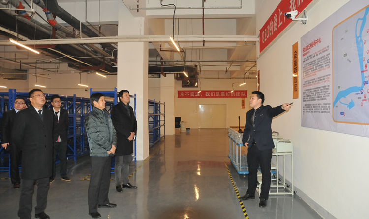隨后,調研團隊一行先后來到城市配送服務中心星隆站和大礱坊站。在配送中心門前,用華億樂購品牌標識系統裝扮一新的配送車輛排列整齊,蓄勢待發。項義水董事長就配送車輛的購置、使用、保養等問題進行了深入的詢問,并騎上電動配送車輛,體驗車輛的騎行感受。走進配送中心,貨架整齊劃一,每排貨架上都有相應的二維碼。據工作人員介紹,配貨員通過手持終端掃描二維碼,可以迅速找到顧客訂單的商品位置,從而保證工作效率。