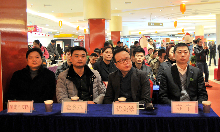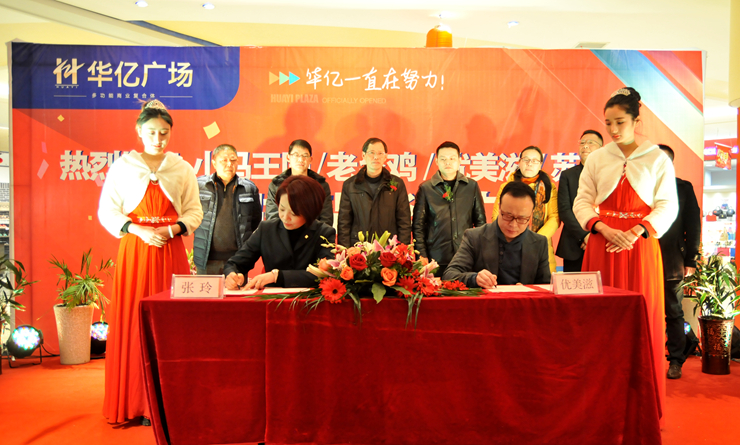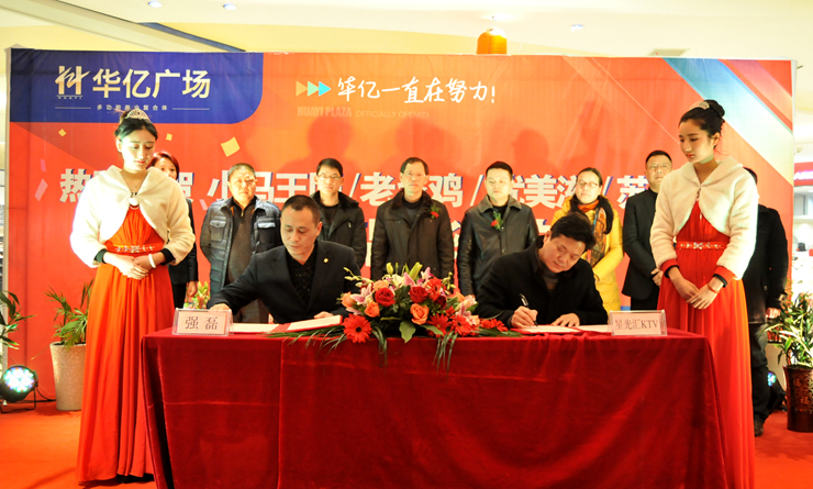 在全場嘉賓的熱烈掌聲中,華億國際總經理張樹華、副總經理張玲、繁昌華億國際常務副總經理王惠瑾、副總經理強磊分別與入駐品牌蘇寧云商、優美茲、老鄉雞、星光匯KTV進行簽約,標志著這些深受歡迎的品牌正式入駐繁昌華億廣場。