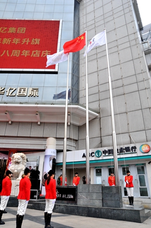 2020年1月1日,華億集團2020年新年升旗儀式暨華億國際購物中心18周年店慶慶典活動在步行街華億廣場隆重舉行。集團董事長項義水,總裁項領,集團財務總監劉建林,集團總裁助理陳雪榮,華億國際全體經營班子成員,以及員工代表參加了慶典活動。華億國際副總經理、旗艦店店總王萍女士主持慶典儀式。