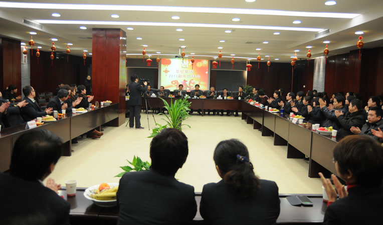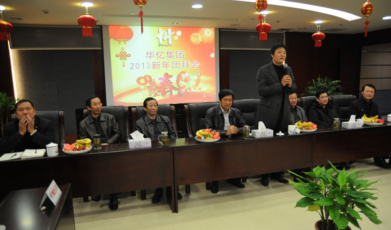 2013年2月18日,農歷大年初九,華億集團新春團拜會在華億國際報告廳如期舉行。 上午10點,集團及各公司中層以上干部歡聚一堂,在華億集團報告廳,圍成了一個“大團圓”。團拜會由集團黨委書記、副總裁陳愛國主持,集團董事長項義水、副董事長章國琴、總裁項領等,出席了團拜會。