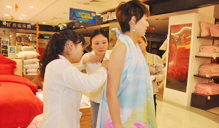 據(jù)了解,今年華億國際開展了“三項三語”競賽活動,所謂的“三項”主要是指專柜無顧客時要做到:商品陳列要整潔美觀富有吸引力;加強專業(yè)知識了解,掌握商品庫存明細;確保專柜內(nèi)衛(wèi)生清潔,保證商場整體美觀。而“三語”主要指專柜有顧客時要做到:當顧客走入柜區(qū)時,微笑服務,使用迎賓語:“您好!歡迎光臨!”;當顧客對某一樣商品感興趣時,鼓勵顧客試穿試用,如讓顧客等候時,需使用致歉語:“對不起,請稍等!”;當顧客離開柜臺時,不論商品有無成交,對顧客的態(tài)度要從一而終,并使用道別語:“請走好!歡迎下次光臨!”在“三項三語”活動基礎上,富有創(chuàng)新意識的華億員工們,開展了這樣一場“神奇的裹布藝術”活動,充分展現(xiàn)了樓層服務人員,對工作的熟悉,對環(huán)境的熟悉,和對美的熟悉。一葉知秋,從這點就反映出員工厚實的基本功,為消費者服務,打下了深厚的基礎。