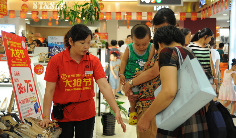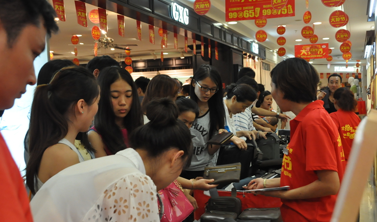 “大搶節 大減價”,營業員的介紹聲開始不絕于耳,商場內的分貝立即高了起來,人聲鼎沸,為了讓大家聽的清晰,營業員們都備上了擴音器,全副武裝的樣子,一下子把消費者的熱情全點燃了。從大門到柜臺,顧客們幾乎是你追我趕,一對夫婦在箭魚鯊男裝專柜一下手就買了12件。一位大姐報了鞋子的號碼后,就開始“亂點鴛鴦譜”,“這雙、這雙、這雙,全部打包,遲了就沒了,大小不合適,回頭再來換,華億服務好著呢!”哎!真是買的沒有賣的精!