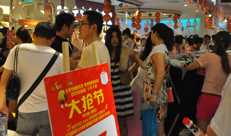 華億國際十天十夜“大搶節”活動在上周末迎來第一波搶購狂潮。兩天時間華億國際購物中心內客流量達到17萬多人次,一時間形成了“人頭上遞錢,人頭上傳票”、人流堪比“春運”的情形。本周來,雖然不是休息日,商場內的照樣人氣旺盛,特別是中午和晚上,大家伙抓緊時間,選購自己的商品。本周末,消費者不僅能買到物美價廉的商品,第二波“搶”IPAD mini、電動車、電影卡的活動又將開始了,目前各方面工作正在積極準備當中。