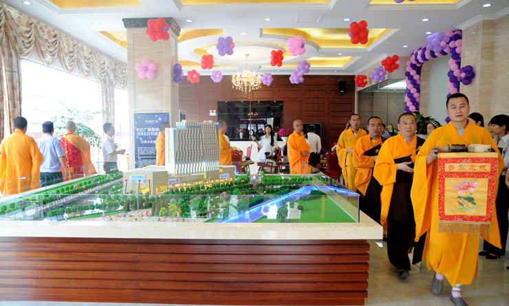 當天上午9時9分,在繁昌華億廣場營銷中心前,九華山大悲樓的法師們開始了開光祈福典禮儀式。慧深法師的大弟子果龍師傅及眾多弟子誦經鳴鐘,繞場灑甘露,為華億廣場開光祈福,并祈愿每一位客戶和到場賓朋幸福安康。現場嘉賓莫不肅靜虔誠,雙手合十,與大師一道祈福。在祈福大典中,大師還對商鋪門牌進行了開光,寓意福照家門、福運綿長;并現場向客戶贈送了已開光的佛珠手串,寄語好運。