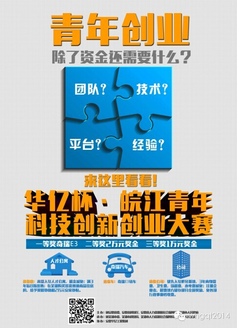 “讓創新創業人才實現‘有車有房有公司’夢想,無疑吸引外界眼球,而這一夢想僅‘一步之遙’。”據團市委相關負責人介紹,11月28日,“華億杯”皖江青少年科技創新創業大賽半決賽結果出爐,非制造業組和制造業組各有10組項目順利入圍決賽,在12月中旬將分別迎來最終“較量”。大賽的一等獎將獲得奇瑞E3轎車一輛,二三等獎分別獲得人民幣2萬元和1萬元獎勵。此外,對落戶蕪湖創業的獲獎團隊,有關部門將予以“房、車、公司”為標志的一系列豐厚獎勵。