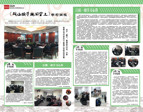 日前,偉晨文化公司組織開展了《別讓猴子跳回背上》讀書學(xué)習(xí)活動,公司五個學(xué)習(xí)小組經(jīng)過學(xué)習(xí)討論,分別形成了學(xué)習(xí)心得,并制作成學(xué)習(xí)簡報。