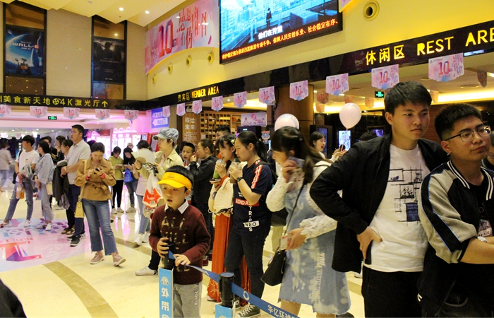 下午1:40分,現(xiàn)場樂隊的精彩表演拉開了影城十周年慶典活動序幕,伴隨著鏗鏘有力、節(jié)奏明快的吉他樂曲聲,那些激動人心的排隊搶票場景、讓人尖叫不息的電影明星見面會、和心上人第一次牽手走進影廳的溫暖瞬間,以及由電影情節(jié)引發(fā)的開懷大笑、感傷落淚等等場景,華億環(huán)球影城給江城影迷帶來的,關(guān)于青春、關(guān)于電影的美好回憶一點點浮現(xiàn)。