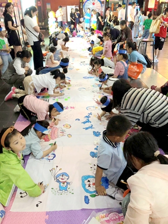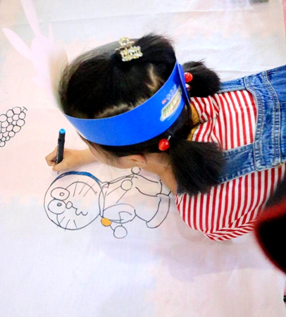 在影城售票大廳內,工作人員已經準備好了畫筆和一塊10米長的畫布。在主持人的組織下,小朋友們分別圍繞在畫布四周,進行繪畫創作,小朋友們十分專注、認真,充分發揮自己的想象力。半小時后,一個個生動活潑的“哆啦A夢”繪畫作品呈現在畫布上,小朋友們的作品得到了陽光畫室老師的大力肯定。