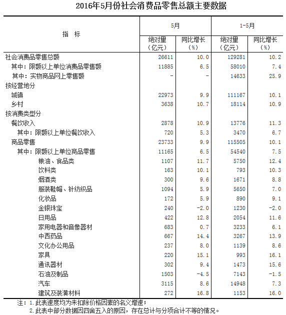 2016年5月份,社會消費品零售總額26611億元,同比名義增長10.0%(扣除價格因素實際增長9.7%,以下除特殊說明外均為名義增長)。其中,限額以上單位消費品零售額11885億元,增長6.5%。