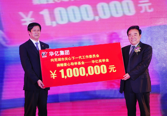 在集團十周年慶典期間,華億集團再興義舉,向蕪湖市愛心助學基金捐資100萬元人民幣,設立"蕪湖市愛心助學基金華億獎學金".9月29日下午,在華億集團成立十周年慶典晚會上,華億集團董事長項義水代表企業,蕪湖市關心下一代工作委員會主任魏道斌代表市關工委和市愛心助學基金,舉行了簡短的捐贈儀式。在受贈后,魏道斌即席發表感言,高度贊揚了華億集團的義舉,表示將用好華億獎學金的每一分錢,讓華億人的愛心真正落到實處。據悉,市愛心助學基金將以這100萬元為母體進行增值性運營,增值部分將全部用于愛心助學。