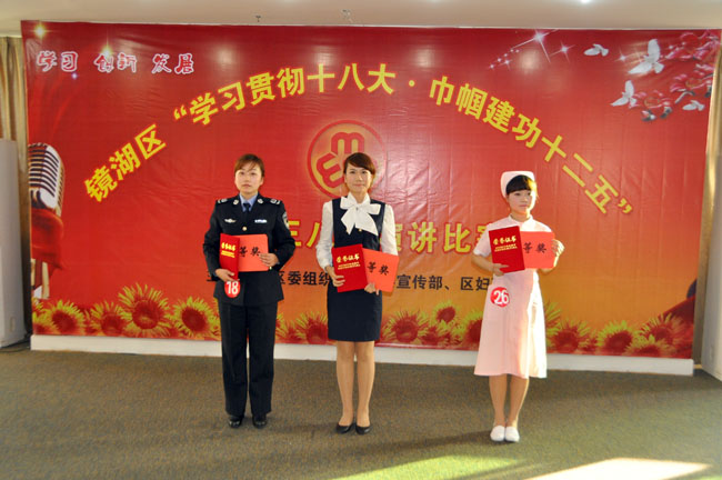 3月6日下午1點(diǎn)30分,由鏡湖區(qū)委組織部、宣傳部、婦聯(lián)舉辦的“學(xué)習(xí)貫徹十八大·巾幗建功十二五”慶“三八”演講比賽在皖江商務(wù)電子中心十二樓會(huì)議室內(nèi)進(jìn)行。此次演講比賽目的就是為了展現(xiàn)全區(qū)廣大女性貫徹十八大精神,立足本職崗位建功立業(yè)的風(fēng)采風(fēng)貌,激勵(lì)更多婦女弘揚(yáng)“四自”精神,敬業(yè)奉獻(xiàn),創(chuàng)先爭(zhēng)優(yōu)。